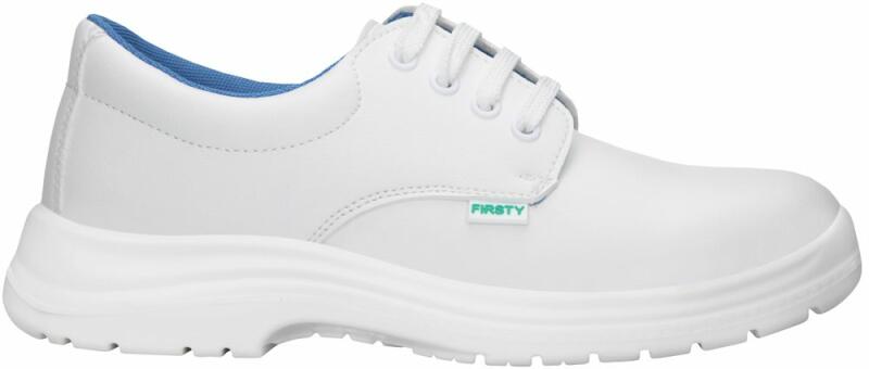 Fehér munkavédelmi félcipő egészségügyi és élelmiszeripari dolgozók számára. Mosható, mikroszálas bevonatú PU bőrből készül, hidrofób felülettel, a talp anyaga poliuretán. A cipő belsejében lélegző anyaggal, amely biztosítja a nedvesség felszívódását.