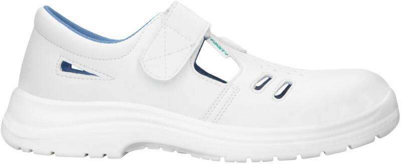 Fehér munkavédelmi szandál egészségügyi és élelmiszeripari dolgozók számára. A felső rész mosható, mikroszálas bevonatú PU bőrből készül, a talp poliuretán. A cipő belseje légáteresztő anyagú, amely biztosítja a nedvesség felszívódását.