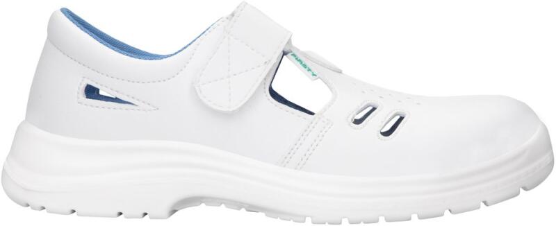 Fehér munkavédelmi szandál egészségügyi és élelmiszeripari dolgozók számára. A felső rész mosható, mikroszálas bevonatú PU bőrből készül, a talp poliuretán. A cipő belseje légáteresztő anyagú, amely biztosítja a nedvesség felszívódását.