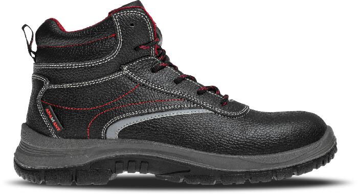 Biztonsági bokacsizma fényvisszaverő elemmel az oldalán, könnyű, kompozit orrmerevítővel és fém alkatrészeket nem tartalmazó talppal ellátva.