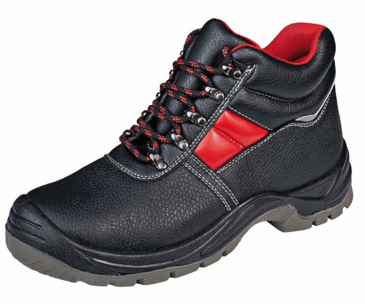 Biztonsági bokacsizma acél orrvédővel, átszúrásálló talpbetéttel, olajálló PU/PU talppal. Felsőrész - dombornyomott hasított bőr. Ezüst fényvisszaverő kiegészítők.