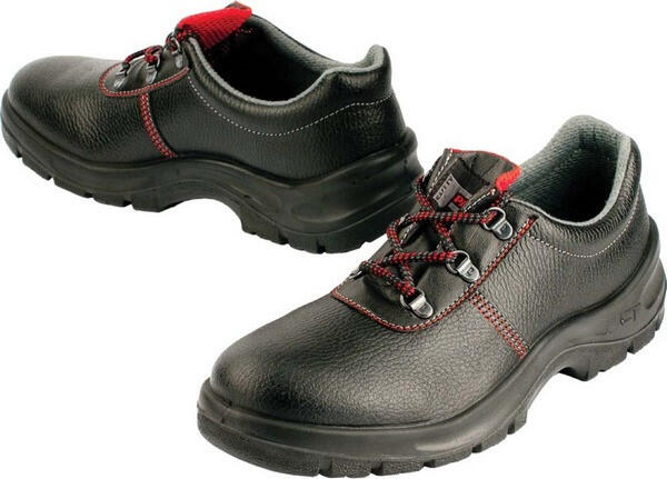Biztonsági félcipő acél orrmerevítővel, antisztatikus, csúszásgátló és üzemanyagálló talppal, energiaelnyelő sarokrésszel és lélegző bőrből készült felsőrésszel.