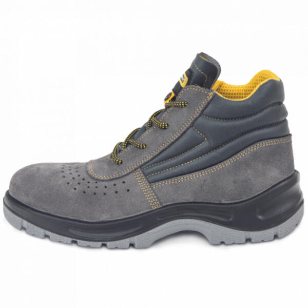 Marha velúrbőr felsőrésszel készült ESD bakancs, fémmentes kivitel, dupla sűrűségű poliuretán külső talppal, kompozit lábujjvédővel és átszúrás ellen védő köztalppal. Iparág: Szállítás és logisztika Szabványok: EN 61340-5-1:2016 Bélés: poliészter háló Felső rész: Suede split leather Jellemzők: Fémmentes talpátszúrás ellen védő köztalp Talp: dupla sűrűségű poliuretán Átszúrás elleni köztalp: kompozit EU-ban készült: Igen Lábujjvédő: kompozit EU-ban készült: Igen Lábujjvédő: kompozit