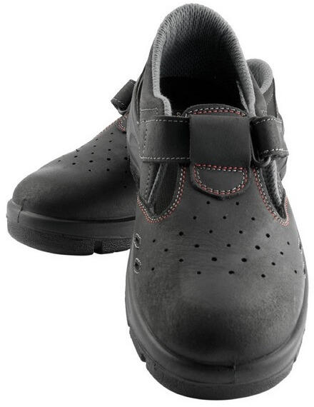 Biztonsági szandál az acél orrmerevítő nélkül, antisztatikus, csúszásgátló és üzemanyagálló talppal, energiaelnyelő sarokrésszel és lélegző bőrből készült felsőrésszel.