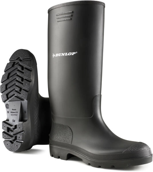 DUNLOP® PRICEMASTOR FEKETE D95535-50 fekete színű tiszta PVC munkacsizma általános ipari és mezőgazdasági felhasználásra ellenáll savaknak, lúgoknak, fertőtlenítőszereknek alaktartó formai kialakítás, vastag, fröccsöntött, csúszásbiztos talp -20 °C-ig használható, csizmabéléssel téliesíthető széles, kényelmes szár-, lábfej- és orr-rész, könnyen felhúzható 35-től 50-es méretig