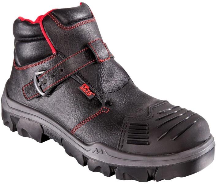 Használat: Beltéri és kültéri egyarántTípus : BokacipőAlkalmazás : Hegesztés, kohászat, vegyipar Felsőrész : Teljes vízálló bőrBélés : Piros színű Artico® bélésNyelv : ARTICO® béléssel ellátott, párnázott bőr békanyelv és bőr hajtókaBokavédelem : 10 mm vastagon párnázott fekete bőrRögzítés : Gyorsoldó rozsdamentes acél csattal  Orrvédelem : Ultra könnyű, extra széles kompozit orrvédelem, mely 200 Joule-ig ellenáll, LIGHT SYSTEM®Talpátszúrásvédelem : Kompozit FLEX SYSTEM® talpátszúrásvédelem, mely hőszigetelt és antimágnesesTalpbetét : PU talpbetét, mely anatómiai és antibakteriálisTalp : PU/Nitril, mely 300°C-ig ellenáll, antisztatikus, olaj- és saválló (FO), HI-CITalp mintázata : Mélyen barázdált, SRC szabványnak megfelelő talp, kivételes stabilitássalSúly (Kg/pár) : 1,2Színek : Fekete - piros felsőrész, sötét szürke - fekete talpMéretek : 38-48Normák : EN ISO 20345:2011 SRCEK típustanúsítvány száma: 0075/020/161/04/18/0586 – EXT 06/06/19Különleges tulajdonság : Szegecsekkel meg
