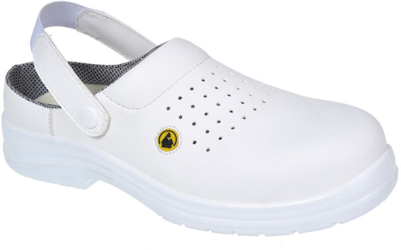 Könnyű biztonsági klumpa perforált felsőrésszel a további légáteresztő képesség érdekében. 100% fémmentes, műanyag szegecses rögzítővel. Alkalmas ESD környezetben történő használatra Megfelel az EN 61340-5-1 szabványnak.