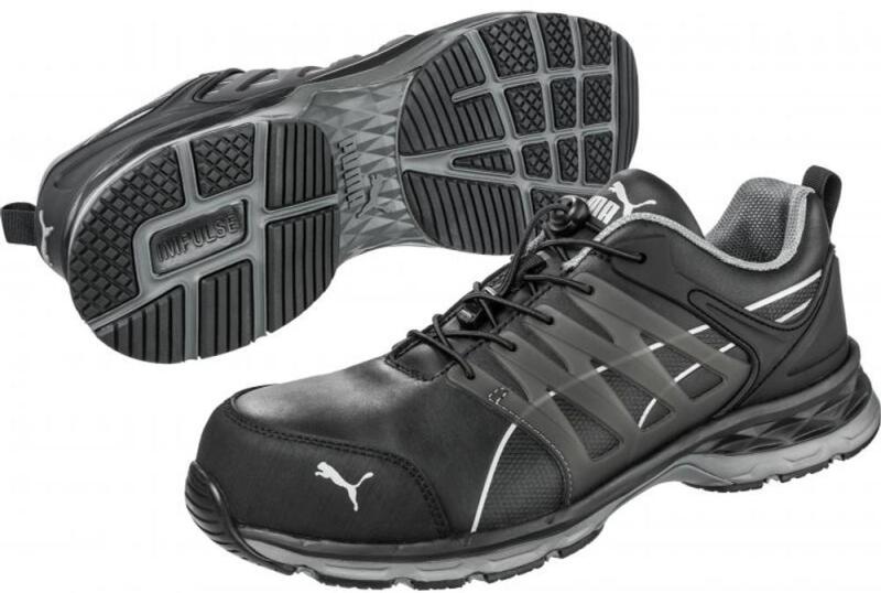 Puma Velocity 2.0 Black Low S3 ESD HRO SRC munkavédelmi cipőAz új Motion 2.0 család tagja. Üvegszálas orrmerevítővel és hajlékony (FAP) kerámiaszálas talpátszúrás elleni védelemmel ellátott munkavédelmi lábbeli. Magas minőségű színbőr felsőrész, TPU megerősítésekkel. Lélegző bélés, evercushion® BA talpbetét. 300°C-ig hőálló, csúszásmentes gumi talp, Impulse. Foam® talpszerkezettel felépítve. További tulájdonságok: ESD védelem, fémmentesség, orrborítás, illetve sarokvédelem, gyorskioldós fűzőrendszer, bónusz cipőfűzők a dobozban.