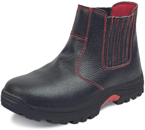 biztonsági kohászbakancs acél lábujjvédővel és átszúrás ellen védő köztalppal antisztatikus, csúszásbiztos, üzemanyagálló, hőálló HRO (300°C) gumi talp, energiaelnyelő sarok bőr felsőrész