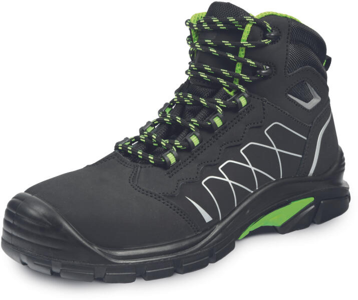 biztonsági bakancs elősorban kültéri használatra a fényvisszavető betétek a fokozott láthatóságért antisztatikus PU/gumi járótalppal rendelkezik, amely kopásálló, üzemanyagálló a felsőrész lélegző nubuk bőr vízlepergető impregnálással a kényelmet a speciális belső talpbetétek fokozzák gélbetétekkel a sarok területén fémmentes kivitel, kompozit lábujjvédővel és átszúrás ellen védő többrétegű textil köztalppal második pár cipőfűző minden dobozban