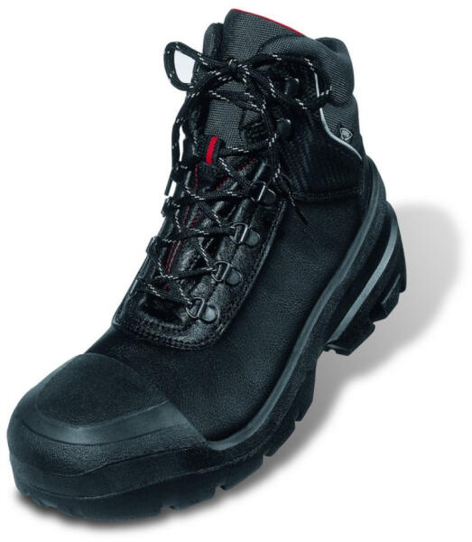 Robosztus, modern, magas szárú bakancs nagy igénybevételre, vízálló bőr felsőrész teljes orrborítás, szellőző textil bélés, széles lábfej és orr-rész, könnyen futó fűzőrendszer, párnázott cipőszár és nyelv, terheléscsillapító uvex 3D hydroflex® betét a sarokcsont alatt, kiegészítő energiaelnyelő zóna elöl, antibakteriális, bőrsemleges, kivehető antisztatikus talpbetét, uvex anti-twist integrált saroktámasz, nagy oldalstabilitás és csavarodás elleni védelem, uvex quatro mélyen barázdált, kiváló csúszásbiztosságú, öntisztító talp, jól tapadó, mászást segítő középrésszel, uvex footfit-system anatómiai belső, hosszan tartó viseletre, lekerekített élekkel, uvex softgrip könnyű, olaj és benzinálló, szilikonmentes, kétrétegű PUR talp, puha közti bélés, acél lábujjvédő és átszúrás elleni talplemez